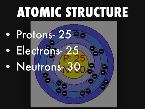The atomic number of manganese is 25 and it has 25 electrons out of which seven electrons are in the last shell or orbit. 25 electrons (white) successively occupy available electron shells (rings). It is crucial to the effectiveness of vitamin b1. 25), this element's most common isotope. Manganese (mn) is a grey white metal that has the atomic number 25 in the periodic table.